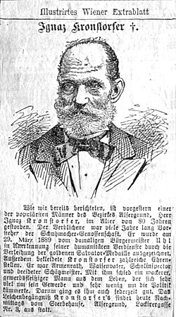 Ignaz Kronstorfer kam 1816[1] in Schweiggers als Sohn des Webers Johann Michael Kronstorfer und der Barbara geb. Ertl zur Welt. Er erlernte den Beruf des Schuhmachers und übte diesen als Meister seines Faches ab 1847 in Wien, Alsergrund aus. Im Jahre 1865 wurde er erstmals zum Genossenschaftsvorsteher der Wiener Schuhmacher gewählt[2] und hatte das Amt bis 1879 über. Ab dem Jahre 1875 war Kronstorfer auch als beeideter Schätzungsmeister aktiv und bekleidete zahlreiche Ehrenstellen als Armenrat, Waisenvater und Schulinspektor. Aus diesen Gründen wurde ihm am 29. März 1889 vom damaligen Wiener Bürgermeister Eduard Uhl in Anerkennung seiner humanitären Verdienste die Goldenen Salvatormedaille[3] verliehen.