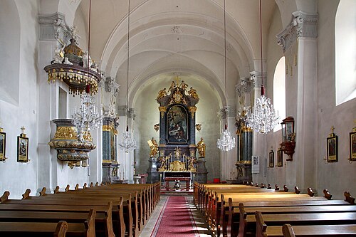 - Das Hauptportal mit Hauptgesims samt Quadratstaffel zum Vortritt, die Kirchentür auf der Seiten mit einer Saguma (umrahmende Schräge), Schaft oder Fußgesims in der Facata in die Vierung, 2 Sakristeitüren, 2 Fenster, beidseits der Chorstiegen 62 Schnecken Staffel, 3 selbsttragende Staffel zum Eingang in Chor, 2 Pfeiler zur Kanzel gemacht, der Sturtz über der Thür, der Sturtz über der Cantzelstiegen, in der Facata das Chorfenster ............ 768 fl 58 kr. Dießer Außzügel ist mir laut Hauptquittung richtig bezahlt worden. Elias Hügel