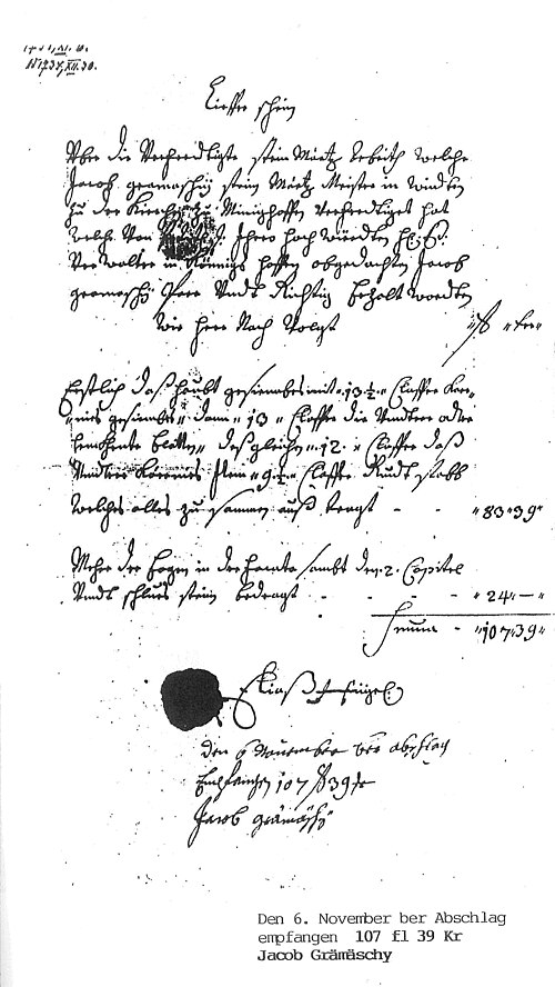 Den 6. November per Abschlag empfangen 107 fl 39 kr Jacob Grämäschi