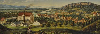 Das Unternehmen Jenny & Schindler kaufte 1838 in Hard die stillgelegte Textildruckerei des Elsässer Samuel Vogel in der Mittelweiherburg und richteten darin eine Türkischrotfärberei und eine Textildruckerei ein.[7] Sie profitierten dabei von den niederen Löhnen und laschen Arbeitnehmerschutzgesetzen bzw. dem behördlichen Vollzug in der österreichisch-ungarischen Monarchie.[8] 1838 wurde auch die bestehende Baumwollspinnerei in Kennelbach und Weberei Liebenstein, wo die Wasserkraft der Bregenzer Ach gut genutzt werden konnten, in Betrieb genommen. Über die Energieumwandlung für die Fabrik Liebenstein ist bekannt, dass hier die Energie seit 1853 aus dem Werkkanal über ein mittelschlächtiges Wasserrad geführt wurde, das erst 1925 gegen eine Kaplan-Turbine der Fa. Voith mit 282 PS bei 187 U/min. ausgetauscht wurde.[9]