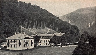 Anno 1904 erweiterte er seinen Betrieb und baute um einen einstöckigen Neubau mit 20 Hotelzimmern[9]. Damit wurde aus einer einfachen Jausenstation eine kleine, aber sehr idyllische Sommerfrische. Durch den unvorsichtigen Umgang eines Hotelgastes mit einem Spirituskocher brach am 12. Juli 1908 ein verheerender Brand aus und die Alte Krainerhütte wurde ein Raub der Flammen[10]. Dem an diesem Tag vorherrschenden starken Ostwind war es zu verdanken, dass die Flammen in die entgegengesetzte Richtung züngelten, sodass zumindest der neu errichtete Hoteltrakt unversehrt blieb. Unverzüglich ließ Dietmann das abgebrannte Gebäude durch einen Neubau ersetzen und nach mehrmonatiger Bauzeit erstrahlte die "Alte Krainerhütte" in neuem Glanz. Im Jahre 1910 pachtete Dietmann von der Stadtgemeinde Baden die gegenüber am linken Schwechatufer gelegene „Neue Krainerhütte – Gasthof zum Grünen Jäger“[11], die er 1931 kaufte[12]. Dort wurden kleine Wohnungen und auch einzelne Zimmer vermietet.