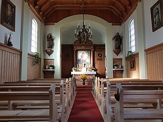 Der Innenraum der Kapelle wird durch einen raumhohen, weitgehend naturbelassenen Holzaltar mit einigen Verzierungen und mit einem Bild der Muttergottes mit Jesuskind dominiert. Im oberen Teil Altars befindet sich in einem stilisierten Sonnenkranz eine weiße Taube, die für Frieden, Freiheit und Reinheit sowie für den Heiligen Geist und damit der Anwesenheit Gottes ein Symbol ist.