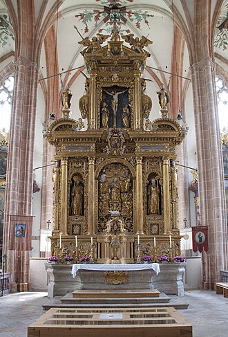Um 1611/12 erhielt die Stiftskirche einen neuen Hochaltar im Stil der Renaissance, der mit fast 20 Meter eine beachtliche Höhe hatte, und es wurde mit dem Neubau der Prälatur begonnen.[2] Um 1613 ließ Abt Kaspar (III.) eine Heizungsanlage an das Dormitorium anbauen. Das seit vielen Jahren im Besitz des Stiftes befindliche Schloss von Reichenau wurde unter ihm als Abt 1614 umgebaut, moderniert und mit einer Mauer umgeben. Um 1618 gab Abt Kaspar (III.) den Bau der Prälatur für das Kloster in Auftrag.[1]