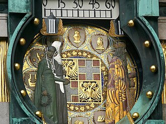 • Herzog Leopold und seine Ehefrau gehören zu den Figuren der Ankeruhr aus dem Jahr 1915. Die Ankeruhr ist eine Spieluhr, die Teil des Hauses der Helvetia-Versicherung, Hoher Markt 10-11, ist.