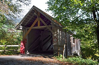 Diese gedeckte Holzbrücke wurde um 1855 weitgehend aus Fichten- und Tannen-Holz errichtet und immer wieder verstärkt und ausgebessert. Die äußeren Schirmbretter sind aus Tannenholz. Es handelt sich dabei auf die Konstruktion bezogen primär um eine parallelgurtige Fachwerkbrücke mit untenliegender Fahrbahn. Durch die unterhalb der Brücke befindlichen Träger (Balken) wird ein Teil der auftretenden Kraft (Last) durch schräge Streben auf das Auflager (Widerlager) abgesprengt. Die Last auf dem Tragwerk wird dadurch in vertikale und horizontale Kräfte aufgeteilt, die von den Widerlagern und den Fundamenten der Streben aufgenommen werden müssen. Daher wird diese Bauform auch als Sprengwerkbrücke bezeichnet. Die hier vorliegende Misch-Bauform zwischen Fachwerkbrücke mit untenliegender Fahrbahn und Sprengwerkbrücke wird auch Hängesprengwerkbrücke genannt.