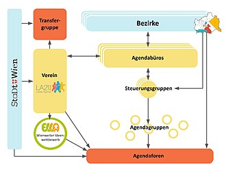 Der Verein der Lokalen Agenda 21 ist an der Schnittstelle zwischen Stadt und Bezirk angesiedelt. Er ist die zentrale Koordinationsstelle für alle Agendaprozesse in Wien. Der Vorstand setzt sich aus Vertretern aller im Gemeinderat vertretenen Parteien zusammen, gibt die strategische Linie vor und trifft finanzielle sowie inhaltliche Entscheidungen. Die Geschäftsstelle ist für die Koordination und Qualitätssicherung der LA-21-Prozesse verantwortlich.