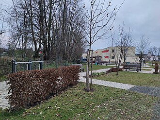 - Der Generationenplatz[2]: ist ein Platz auf dem überdimensionale Blumen zu finden sind, die auf Knopfdruck Musik abspielen können. Ebenfalls ist ein gratis WLAN-Hotspot verfügbar, der für moderne Kommunikation dienen soll. Direkt an den Platz ist auch ein Fitness-Park für Senioren angeschlossen, der beim Körpertraining für eine Prävention von Stürzen helfen soll.
