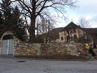 Der ursprüngliche Wirtschaftshof wurde im ersten Drittel des 18. Jahrhundert zu einem Barockschloss umgebaut, von dem heute allerdings nur mehr Teile erhalten sind beziehungsweise wiederhergestellt wurden. Von den vier Trakten, die ursprünglich um den schmalen, querrechteckigen Innenhof gruppiert waren, ist heute nur mehr die achtachsige Süd-Front erhalten, an welche sich der später wieder erbaute Ost-Trakt anschließt, welchen ein schmaler Weg vom steilen Abhang des Grabens trennt. Heute ist die Fassade in grün-weiß gehalten und das Erdgeschoß an den Außenfronten genutet. Durch das Gurtgesims werden das Haupt- und oberes Mezzaningeschoß vom Sockel abgehoben. Die beiden oberen Geschoße sind durch vertikale Putzbänder verbunden, die Fenster des Hauptgeschosses sind durch die aufgesetzten Putzverzierungen hervorgehoben.[1]