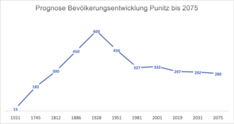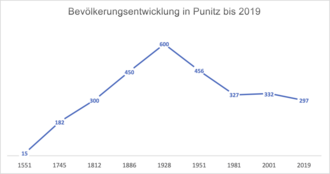 Wie an der Grafik ersichtlich hat Punitz in den letzten Jahrzehnten eine negative Bevölkerungsentwicklung erfahren, wie auch die umliegenden Ortschaften und der Rest des gesamten Südburgenlandes.