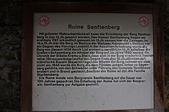 | Überregionale Aspekte dieses Themas werden auch in der Wikipedia unter dem Titel Burgruine Senftenberg behandelt. Hier im ÖsterreichWiki befinden sich Informationen sowie Ergänzungen, die zusätzlich von regionaler Bedeutung sind (siehe Mitarbeit). |
