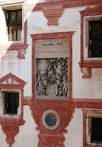 1490 brannte Burg Tratzberg bis auf die Grundmauern aus, durfte aber relativ rasch wieder einigermaßen hergestellt worden sein.[4] Im 16. Jahrhundert wurde die Burg zu einem Renaissanceschloss umgebaut. Die Bauphasen 1500-1533 und 1560-1589 gelten als die wichtigsten Bauphasen von Schloss Tratzberg, das damals im Wesentlichen sein bis heute erhaltenes Aussehen bekam.[5] Nachdem die Burg um 1500 durch einen Tausch in den Besitz der Brüder Veit Jakob und Simon Tänzl gekommen war, erfolgte der erste große Um- und Ausbau, durch den aus der Burg allmählich ein Renaissanceschloss wurde. Unter den Brüdern Tänzl wurde die noch heute erhaltene Schlosskirche "Zur Heiligen Katharina" erbaut, deren Altäre 1508 geweiht wurden. Als Hommage an ihren Gönner, Kaiser Maximilian I. († 1519), die zugleich ein geschickter politischer Schachzug war, ließen die Brüder die Wände des Festsaals vor 1508[6] mit einem eindrucksvollen Habsburgerstammbaum ausstatten.[7] Wesentliche Bauarbeiten fanden zwischen 1500 und 1508 statt, weitere Innen- und Außenarbeiten an den beiden Geschoßen der Burg waren bis 1514 abgeschlossen. Der Umbau zum Renaissanceschloss fand im dritten Viertel des 16. Jahrhunderts unter dem Besitzer Georg Ilsung statt. Unter dem Besitzer Jakob Fugger erhielten die Räume historisierende Namen.[8] Seine Funktion als Festung hatte Schloss Tratzberg im 16. Jahrhundert längst verloren. Obwohl durch den Einsatz von und gegen Feuerwaffen zur Befestigung von Tratzberg neue Wehrelemente erforderlich gewesen wären, wurde auf diese verzichtet.[5]