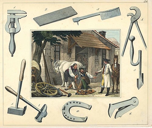 - Das Meisterstück des Schmiedes: ein halber vorderer Wagen mit eigenen neuen Eisen zu beschlagen, samt einem jungen Ross, welches ihm angewiesen wird, mit vier neuen Eisen ohne Fehl und Mangel zu beschlagen ...