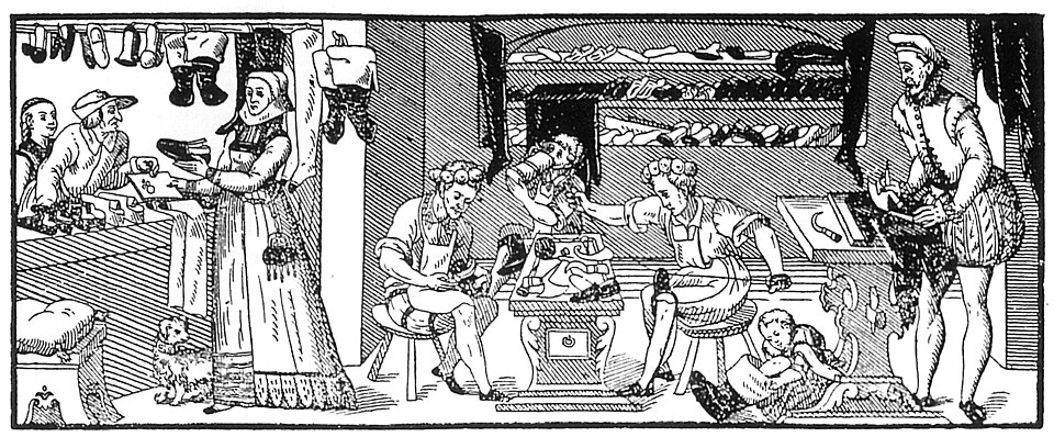 Bis ins 19. Jahrhundert wurden alle Fußbekleidungen, von den einfachen bis zu den kompliziertesten .. nur genäht. Also bis Ende des 19. Jahrhunderts ganz oder zum größten Teil mit Handnäharbeit verfertigt wurden. 1560 stellte man die ersten Nähnadeln von Chreening her. Wann diese hierher kamen ist unbekannt. Aber selbst die Nähnadel nützte dem Schuhmacher nicht viel, er brauchte dazu unbedingt den Fingerhut. Den Fingerhut erfand 1684 Nikolaus von Beschvoten in Amsterdam.[3]