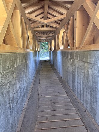 Die Brücke liegt auf 2024 sanierten Widerlager am Ufer auf und die Last der Brücke wird vom Tragwerk aus Beton in vertikale und horizontale Kräfte aufgeteilt, die von Widerlagern aufgenommen werden müssen. Das Satteldach der Brücke ist mit Lärchenholzschindeln eingedeckt.