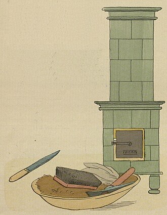 - Im I. Stock, 1. Zimmer: ein grüner Kachelofen (innen schlecht), 2. Zimmer: ein brauner Kachelofen und im Kabinett: ein Kachelofen.