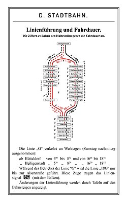 Gemäß dem Liniensignal verkehrte die Linie G stets auf der Gürtellinie der Stadtbahn. Sie war in den Jahren 1926/27 bis 1979 zwischen Hütteldorf und Heiligenstadt immer nur zu den Hauptverkehrszeiten und sonntags in Betrieb. In den Jahren 1947 bis 1954 wurde sie bei Bedarf zusätzlich zu einer vollwertigen ganztägig und -wöchig betriebenen Linie auf der eigentlichen Gürtelstrecke zwischen Meidling und Heiligenstadt.