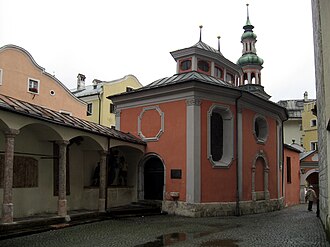- die Wolfgangskapelle: Sie wurde von Florian Waldauf von Waldenstein als Heiltumstuhl[A 1] zur Präsentation seiner Reliquien gestiftet und nördlich der Nikolauskirche erbaut. Ihre Brüstung war auf den Stadtplatz von Hall ausgerichtet. 1505 wurde die Wolfgangskapelle geweiht und entwickelte sich danach zu einer beliebten Wallfahrtsstätte. Sie wurde durch ein Erdbeben im 17. Jahrhundert zur Gänze zerstört und dann durch die Josefskapelle ersetzt.[7] Diese wurde um 1690 als Grabkapelle der Grafen Khuen-Belasy erbaut.