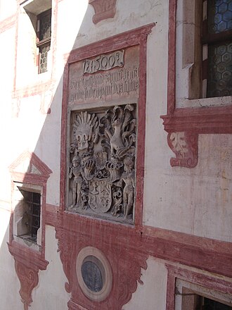 - Von Veit Jakob Tänzl hat sich außerdem sein stark abgetretener Grabstein im Boden des Knappenchors in der Pfarrkirche von Schwaz erhalten. Ebenfalls erhalten ist auch sein Totenschild mit einer plastischen Wappengruppe, der ursprünglich an einem Freipfeiler dieser Pfarrkirche aufgehängt war, ehe er in der zweiten Hälfte des 18. Jahrhunderts unter die Orgelempore dieser Kirche verlegt wurde. Nachdem er um 1832 auf ihren Dachboden ausgelagert worden war, befindet er sich seit 1839 auf Schloss Tratzberg. Hergestellt wurde er vermutlich von dem in Innsbruck ansässigen Bildschnitzer Christof Lechner (Lehner).[7]