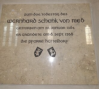 - Nach seinem Tod dürfte Wernhard der Schenk in der von ihm gestifteten Pfarrkirche beigesetzt worden sein.[6] Sein Grabstein aus rotbraunem Marmor war noch im 19. Jahrhundert dort im Choraufgang aufgestellt, ist aber seit dem Abbruch dieser Pfarrkirche verschollen.[4] Heute erinnert in der 1881 neu erbauten Pfarrkirche Hütteldorf eine Gedenktafel an ihn, die 1964 aus Anlass seines 600. Todestages angebracht wurde.